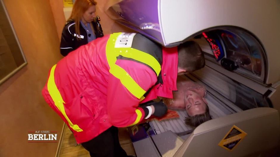 Auf die Beamten wartet ein in Frischhaltefolie gewickelter Mann in einem Solarium.