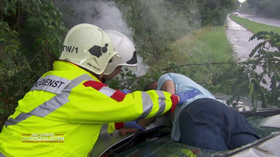 Die Einsatzkräfte müssen sich nun um einen kuriosen Autounfall kümmern. Ein Auto ist gegen einen Baum gefahren, doch bei dem Mann in der Windschutzscheibe handelt es sich um einen völlig Fremden ...