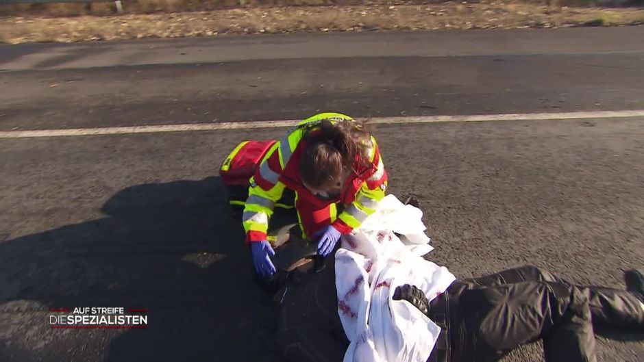 Die Rettungskräfte machen sich auf den Weg zu einem Unfall auf der Autobahn. Vor allem der Fahrer eines Motorrades scheint schwer verletzt zu sein. Und warum ist er mit einem Laken bedeckt?