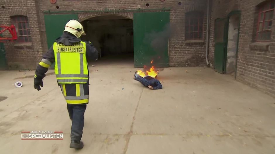 Auf einem Reiterhof wird ein Brand gemeldet. Am Einsatzort eingetroffen, finden die Feuerwehrleute einen Mann, dessen Beine in Flammen stehen.