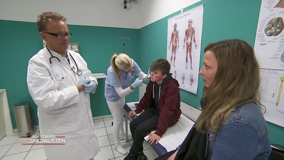 Nachdem der Schornsteinfeger versorgt ist, kann sich der Arzt nun um den wartenden Teenager kümmern. Dieser scheint unter entzündeter Akne zu leiden.