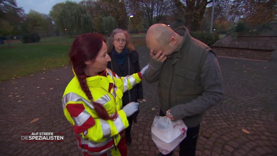 Die Sanitäter verfolgen einen Hilferuf in einer Kirche und sind auf der Suche nach der Verletzten. Vor der Kirche entdeckt einer der Sanitäter dann die bewusstlose Frau die an der Hauswand hängt.