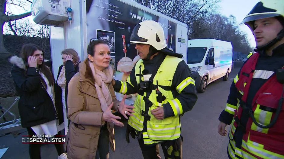 Die Rettungskräfte werden zu einer Cateringfirma gerufen. Dort herrscht große Sorge um die zwei vermissten Mitarbeiter, die sich noch im Gebäude befinden.