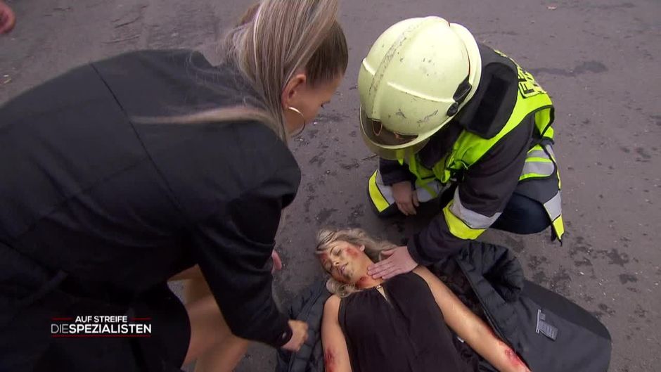 Eine Frau ist in großer Sorge um ihre Freundin, deren Auto während einer Feier Feuer gefangen hat. Noch wissen die Rettungskräfte nicht, ob sich die Freundin noch im Auto befindet.