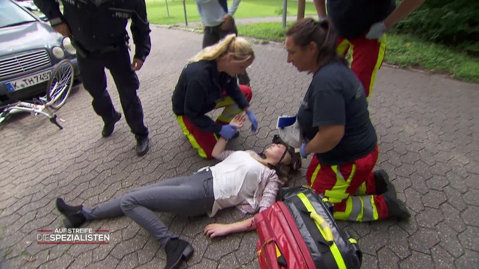 Die Einsatzkräfte müssen sich jetzt um einen eher rätselhafen Unfall kümmern. Am Unfallort finden sie die verletzte Radfahrerin vor, das beteiligte Auto ist jedoch leer.