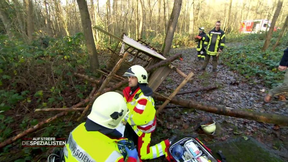 Ein Försterentdeckt in seinem Wald einen Mann, der von einem Hochsitz gefallen ist. Der Mann ist eingeklemmt!