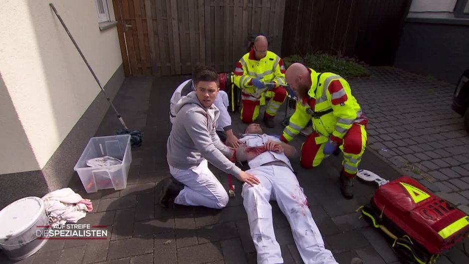 Eine Frau meldet den Rettern einen schlimmen Unfall. Ein Mann hat die Kontrolle über sein Auto verloren und ist in ein Gerüst gerast. Auf dem Gerüst war gerade ein Maler bei der Arbeit. Beide Männer sind verletzt.
