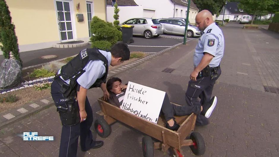 In den frühen Morgenstunden liegt eine Frau schlafend in einem Bollerwagen. Als sie erwacht und das Schild mit der Aufschrift: "Heute frischer Hühnerbraten!" entdeckt, gerät sie in Panik.