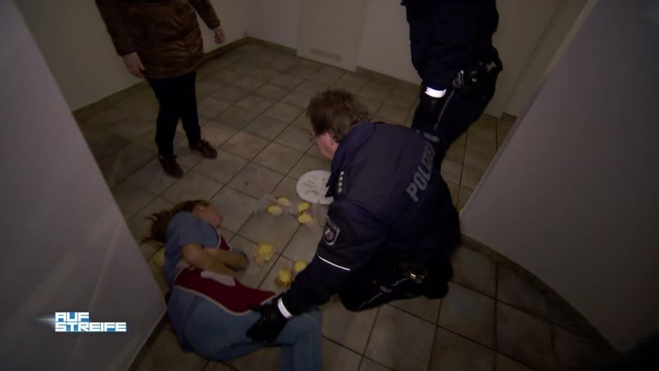 Die Beamten werden gerufen, weil eine schwangere Bäckerin von einer Treppe geschubst wurde.