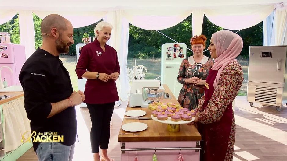 Kandidatin Sara setzt im Finale auf ihre zwei Lieblingsgebäcke: Blaubeer-Donuts mit Diplomaten-Creme-Füllung und Mini-Eclairs mit Waldbeere und Sahnecreme. Und alles schimmert in Rosa und Gold!