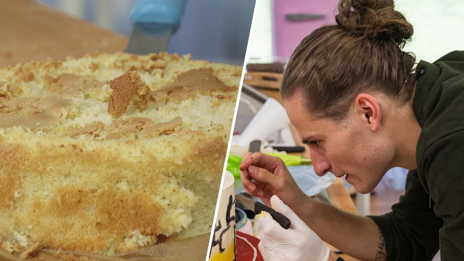 Bei Tom ist Ausnahmezustand in der Backstube angesagt: Seine Böden zerbröseln beim Herausnehmen aus der Form. Er ist optimistisch: "Das wird nachher noch wieder dran geklatscht." Kann Tom seine Fehler bei "Das große Backen" 2023 kaschieren?