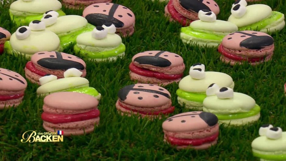 Barbaras Sommerwiese wird geziert von kleinen Fröschen und Marienkäfern. Die Macarons sind gefüllt mit einer Tequila-Limetten-Creme einer Erdbeer-Buttercreme mit Basilikum-Kern. Kann sie die Jury damit begeistern?
