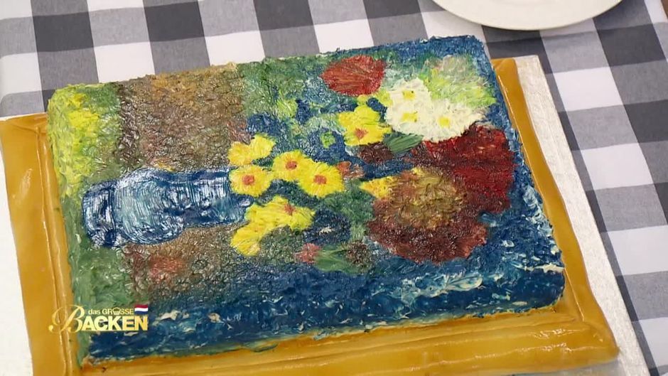 Kandidatin Laura hat aus einem Haselnuss-Rührteig, einer Mascarpone-Minz-Creme, einem Birnenkompott und einem Nuss-Krokant eine Van Gogh-Torte kreiert. Ihre Torte ist nicht hochgestapelt, aber punktet durch Details.