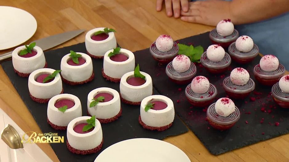 Bei Kandidatin Barbara wird es abgehoben: Sie zaubert kleine metallische Himbeer-Ufos mit Chili-Ganache und Drachenfruchtmousse-Törtchen mit Salzkaramell-Kern. Der Metallic-Look zieht sich durch ihre ganze Präsentation.