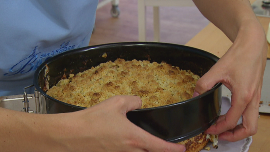 Caterinas Streuselkuchen mit Pudding und Rhabarber klingt so vielversprechend und saftig. Leider zerläuft das Meisterstück als Caterina die Form zu früh entfernt. Ist der Lieblingskuchen noch zu retten?