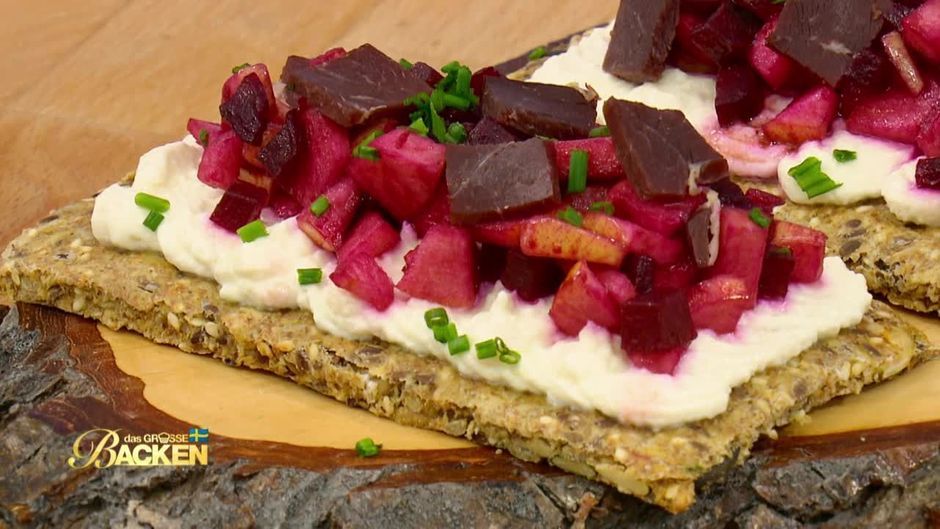 Kerniges Vollkorn-Knäckebrot belegt mit einer Meerrettich-Creme, Rote-Bete-Apfel-Tartar und Rentierschinken. Trifft Laura mit dieser Kombination den Geschmack der Jury?