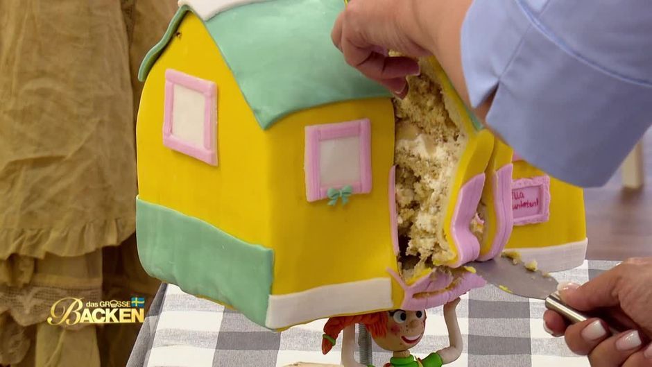 In der Pipi Langstrumpf Motivtorte verbirgt sich ein Haselnuss-Kuchen. Verfeinert wird dieser mit einer Vanille-Buttercreme sowie einer Apfel-Marzipan-Füllung. Ein Zimt-Nuss-Crunch sorgt für eine knackige Konsistenz und rundet das Ganze zusätzlich ab. Sichert sich Laura mit dieser Torte den Einzug ins Finale?
