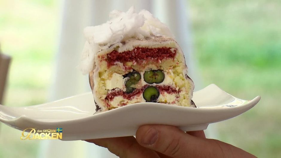 Im Inneren der Pipi Langstrumpf Torte steckt ein Rote-Bete-Schokokuchen, der mit einer Limonaden-Buttercreme verfeinert ist. Veredelt wird das Ganze mit frischen Blaubeeren. Während Waffeln der Torte eine neue Textur verleihen. Wird sich Jennifer mit dieser Kreation ins Finale backen?