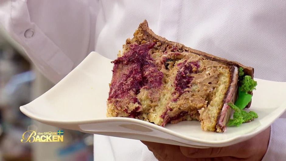 Im Inneren der Ronja Räubertochter-Motivtorte verbirgt sich ein Haselnuss-Kuchen mit einer Nougat-Buttercreme. Als Fruchteinlage dienen Waldbeeren und ein Beerengelee. Krokant sorgt für etwas mehr Crunch und Süße. Backt sich Sara mit dieser Torte ins Finale?