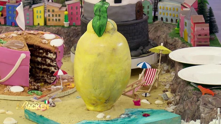 Süßes oder Saures? Kandidatin Jennifer zaubert eine fruchtige Motivtorte in Form einer Zitrone. Ihr Rührteig ist geschichtet mit einer Limoncello-Mousse, Zitronen-Chutney und Zitronenkaviar-Profiterols.