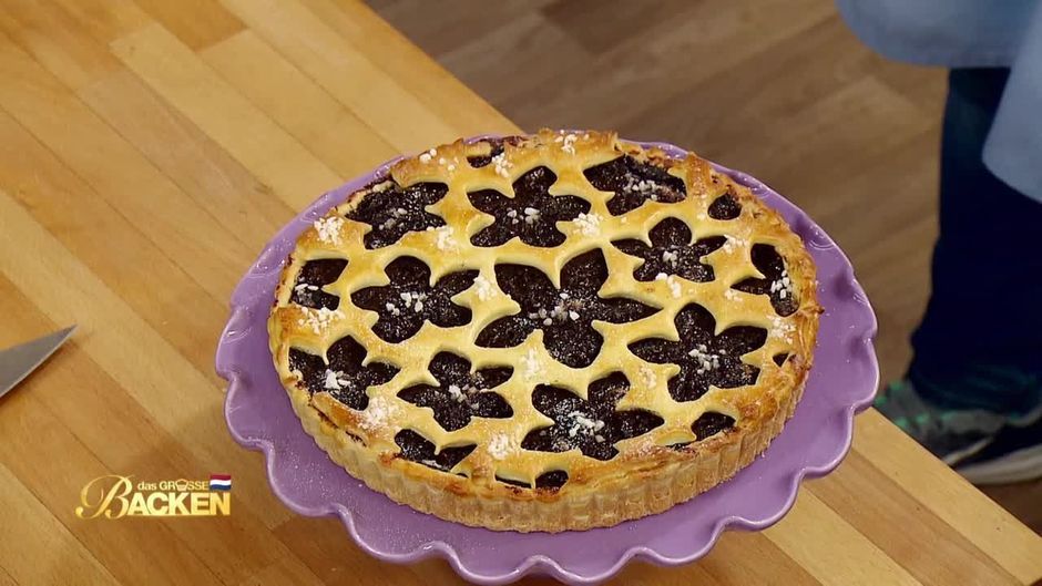 Steve hat einen Hefeteig mit Schokopudding, Amaretto-Pflaumenmus und Marzipan-Walnüssen gebacken. Aus der Decke des Vlaai hat er Blumen ausgestochen, die die Füllung zeigen. Getoppt wird mit Hagelzucker.