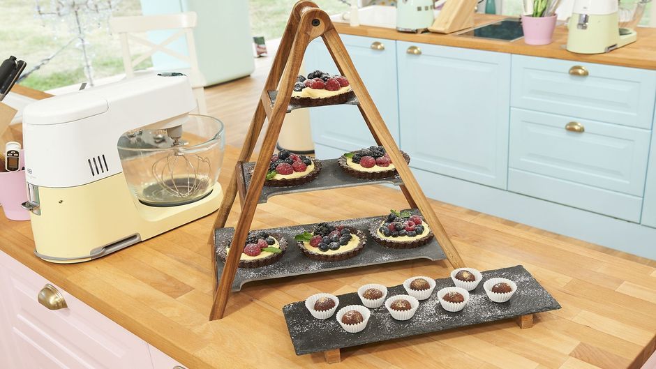 Nach der ersten Aufgabe kann man auf Janets Sweet Table fruchtige Beeren-Tartlettes mit einer Mandelcreme und Amaretto-Mascarpone-Kugeln im Schoko-Mantel finden. Wie gefallen Betty und Christian die kleinen Köstlichkeiten für Jantes Landhaus-Hochzeit?