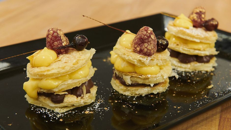 Lucille präsentiert der Jury die italienische Interpretation des französischen Klassikers Mille-Feuille, bestehend aus selbstgemachten gezuckerten Blätterteigschichten mit Schoko-Creme, Creme Patissier, frischen Himbeeren und Karamell Haselnüssen.