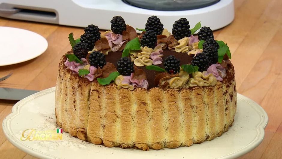Sara kreiert eine Mischung aus Tiramisu und Mousse. Ihre Grundlage bildet ein Löffelbiskuit, der mit einer Mascarpone-Sahnecreme sowie mit Espresso, Brombeer- und Schoko-Mousse verfeinert wurde.