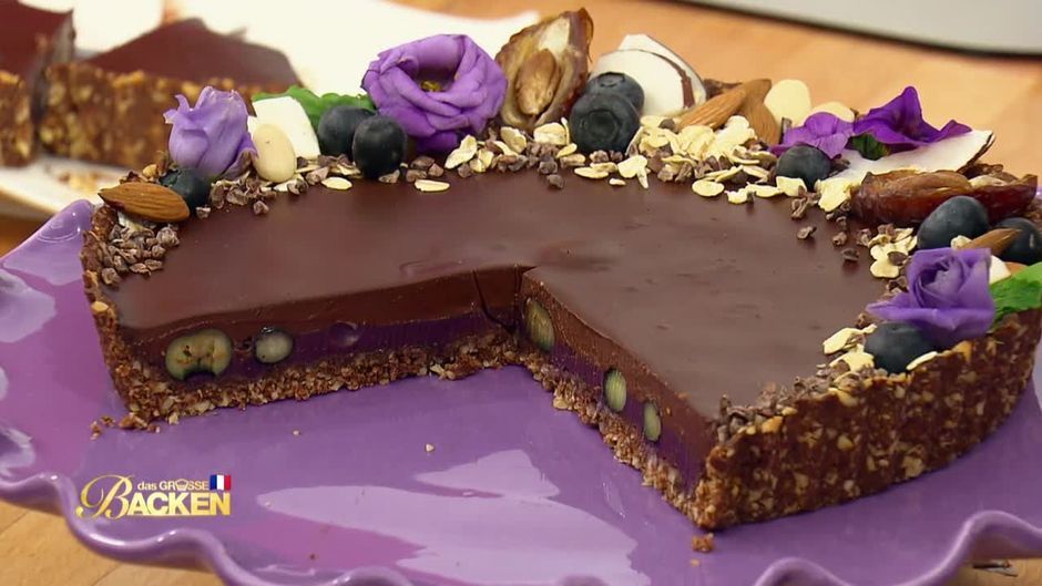 Sara hat sich mal vegan ernährt und backt deswegen eine vegane Tarte. Der Teig besteht aus Hafer und Datteln, darauf gibt Sara einen Heidelbeer-Pudding, eine Schoko-Ganache und rosa Pfefferbeeren. Was sagt die Jury zu dieser Kombination?