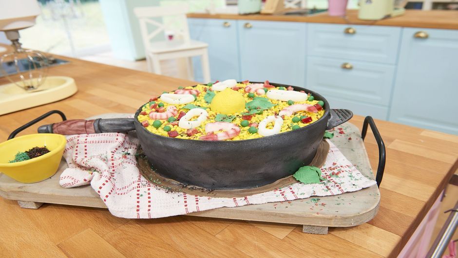 Janet backt eine spanische Paella aus Kokos-Kakao-Biskuit und Maracuja-Buttercreme. Ihre Pfanne verziert sie mit Reis und Meeresfrüchte aus buntem Fondant. Wie gefällt der Jury ihre Kreation?