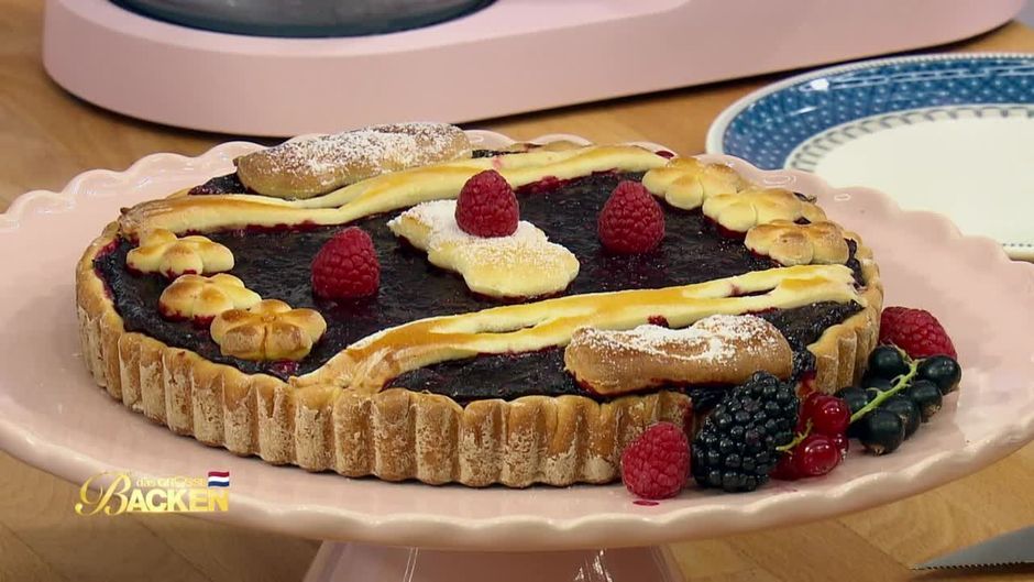 Kandidat Christoph hat einen Vlaai aus Hefeteig mit Vanillepudding, Waldbeer-Kompott und Johannisbeer-Schnaps gebacken. Seinen Vlaai verziert er mit Hefeteig-Streifen im Jugendstil, passend zur Architektur in den Niederlande.