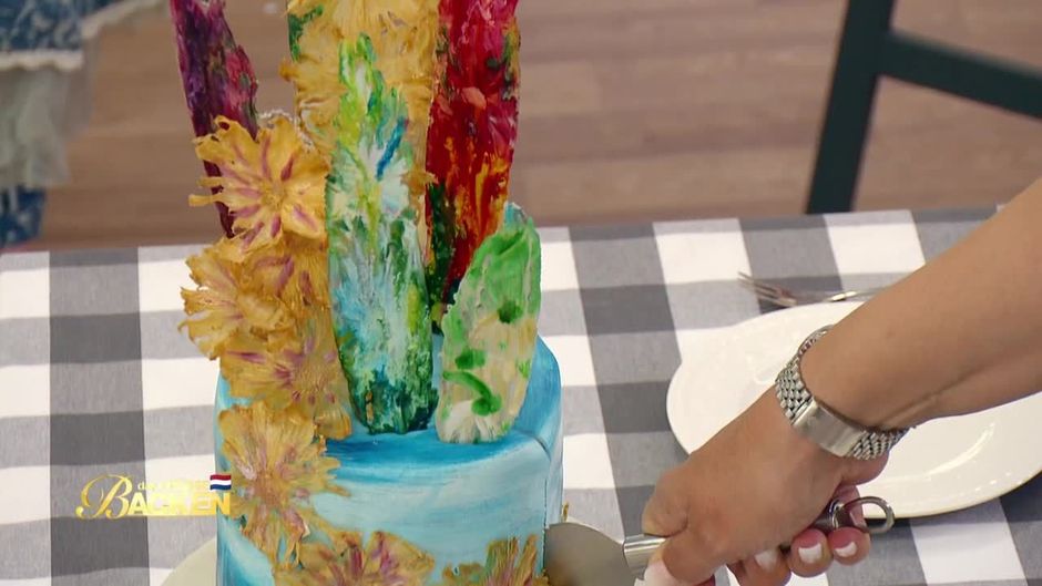 Jennifer hat einen Zitronen-Buttermilch-Kuchen mit einem Johannisbeer-Mousse, einem Granatapfel-Gelee und einem Erdnuss-Krokant gebacken und alles mit bemalten Blütenplatten verziert.