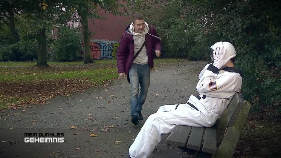 Werbetexter Chris wacht eines Morgens auf einer Parkbank in einem Astronautenkostüm auf!