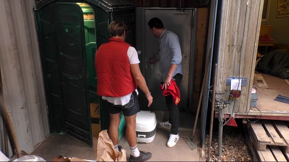 Nachdem der tägliche Campingklowechsel auf der Baustelle ansteht, gibt es ein Problem: Die Toilette ist so überfüllt, dass sie Johannes nicht alleine tragen kann. Doch Daniel stürmt schnell zur Hilfe und die beiden Männer meistern die Aufgabe gemeinsam.