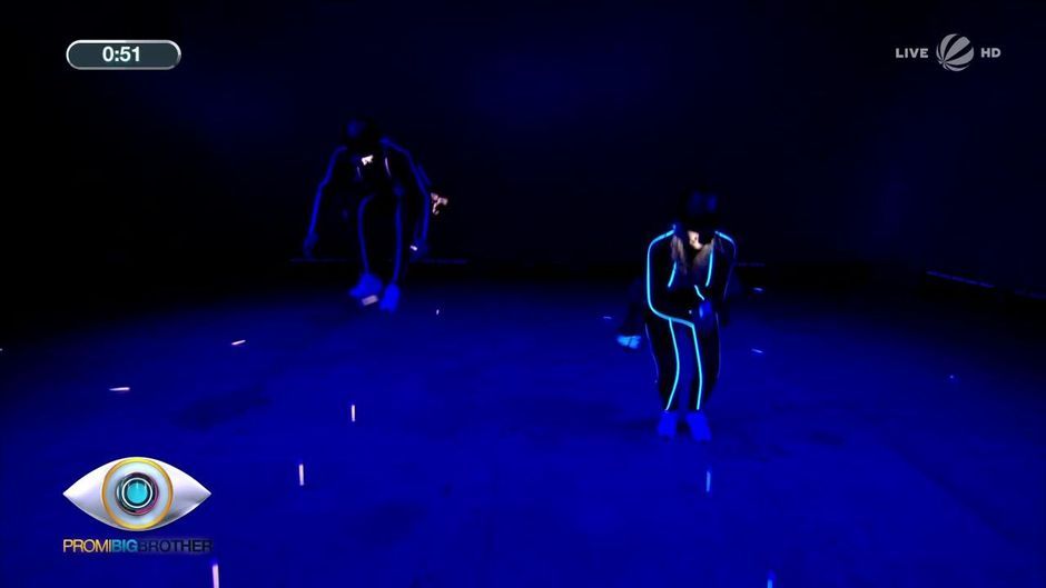 Heute ist Kondition gefragt: Chethrin und Daniel müssen möglichst viele Leuchtstäbe mit einem Sprung in die Luft befördern und fangen. Dabei steht einiges auf dem Spiel: Der Gewinner darf entscheiden, wer heute vor der Nominierung geschützt ist.