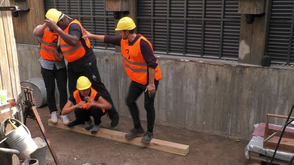 Hier ist Teamwork und Balance gefragt. Auf einem schmalen Balken müssen die Bewohner der Baustelle die Plätze tauschen. Ist der Zusammenhalt groß genug?