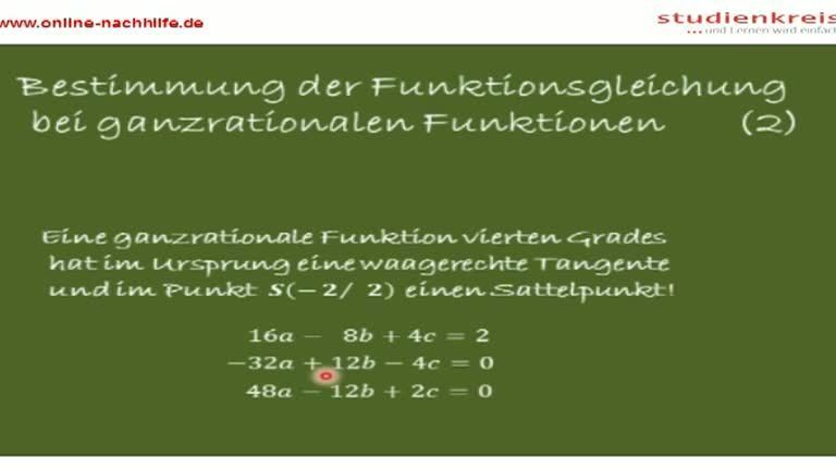 Wie kann die Funktionsvorschrift einer ganz-rationalen Funktion ermittelt werden? In diesem Video zeigen wird den zweiten Schritt, indem wir das Gleichungssystem lösen und eine Funktionsvorschrift aufstellen.