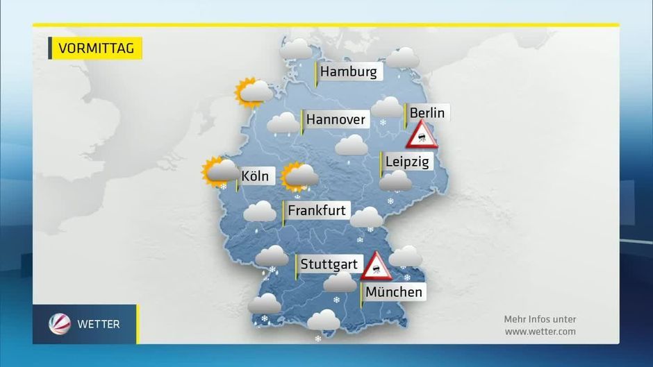 Am Vormittag verlagert sich eine Regenfront langsam weiter Richtung Osten. Dabei kommt es auch zu Schnee mit Glätte.