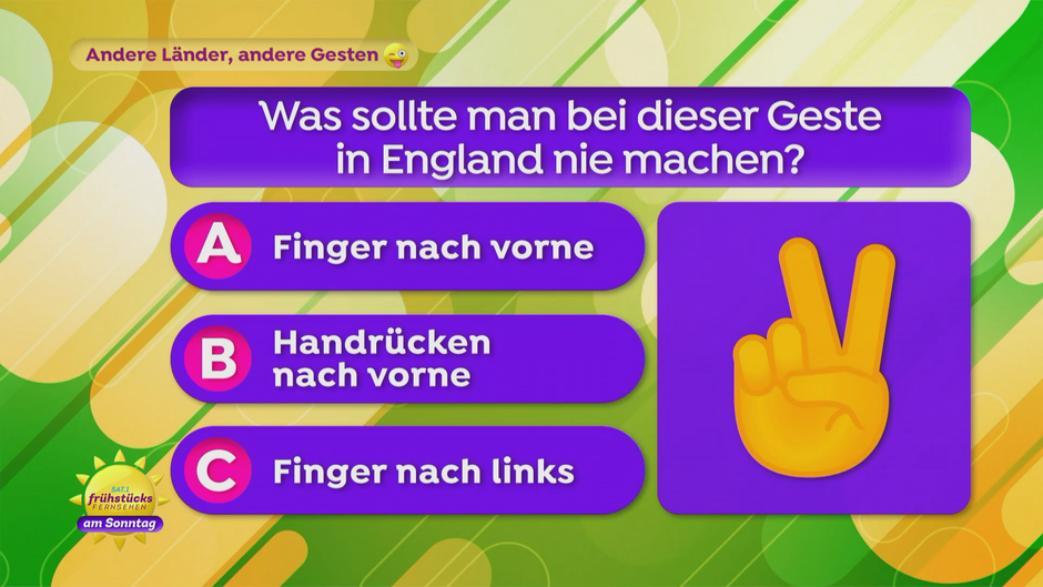 Damit Sie sich im Ausland nicht blamieren, hat Olcay wertvolle Tipps für uns dabei. Beim Quiz werden unsere Moderator:innen auf die Probe gestellt: Wie gut kennen sie sich in der Gestenkunde aus?