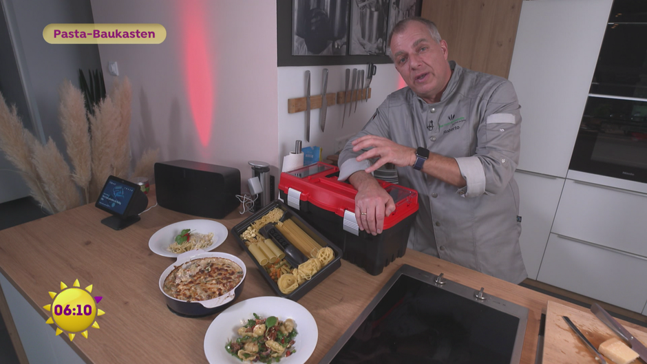 Immer nur dieselben Nudeln mit derselben Sauce? Nicht mit Profi-Koch Roberto Enßlen! Der Koch öffnet seinen Pasta-Baukasten und präsentiert Frühlings-Pasta-Salat, Angeber-Cannelloni und scharfe Spaghetti für Pasta-Einsteiger.