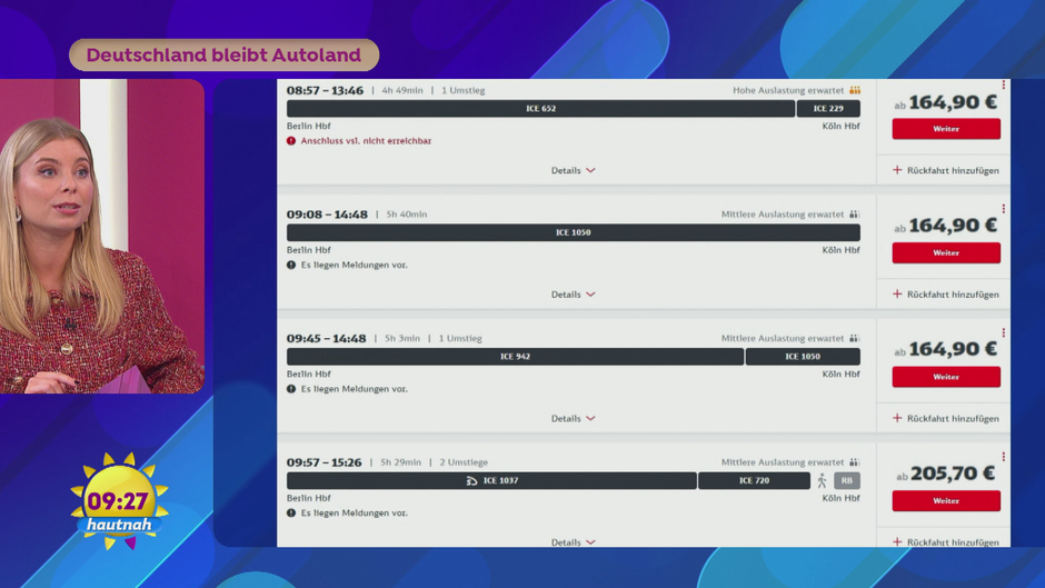Autofahren ist immer noch das beliebteste Fortbewegungsmittel in Deutschland trotz des Wissens über nachhaltige Alternativen. SAT.1-Reporterin Samira Classen stellt die Gründe dafür vor und hat ein Beispiel für eine Fahrt von Berlin nach Köln dabei.