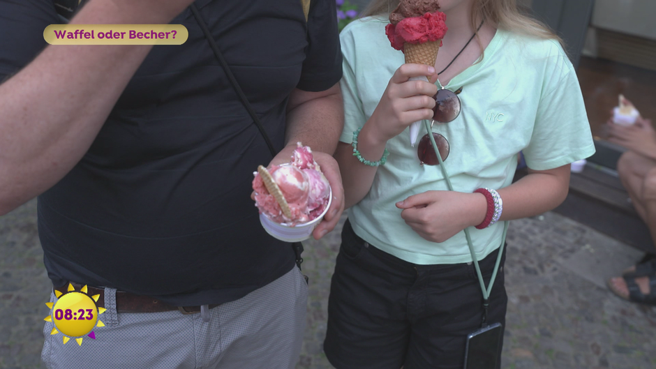 Waffelgesicht oder Becher-Typ? Könnt ihr erkennen, ob der Einkäufer ein Eis in der Waffel wählt oder ein Eis im Becher? Marlene und Boschi machen mit Lukas den Test …