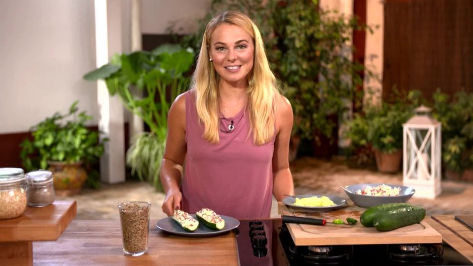 Das erste Rezept der Woche ist ein schnell gemachtes Gericht für jede Tageszeit: Gurkenschiffchen mit einer Protein-Füllung aus körnigem Frischkäse, Sonnenblumenkernen und Gewürzen.