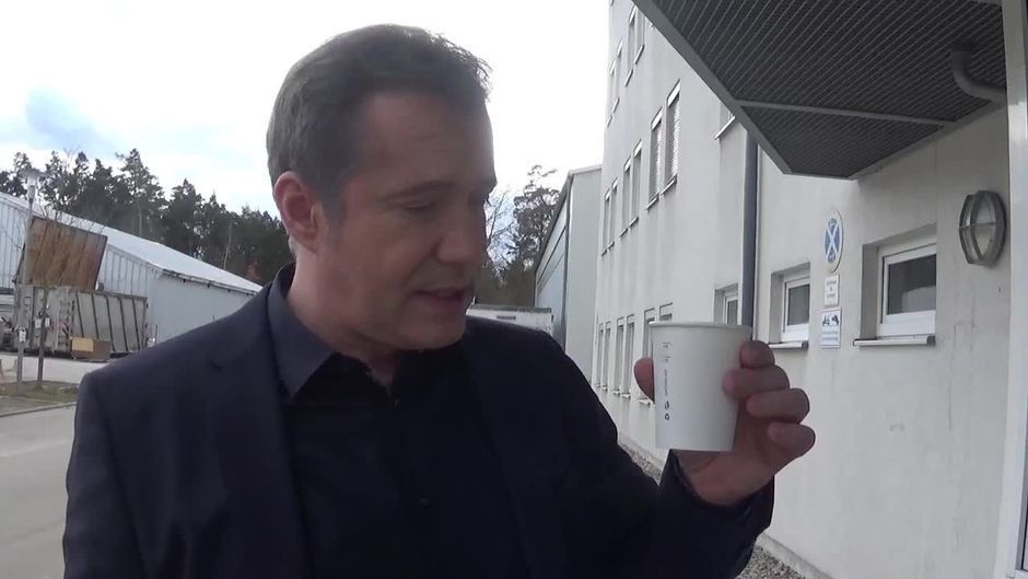Alexander trinkt seinen Kaffee aus einem Einwegbecher. Wo ist das richtige Geschirr geblieben?